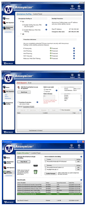 Anonymizer Anti-Spyware™ now prevents spyware before it is downloaded onto your PC through its real-time, Active-x shield. If spyware is already a problem for you, Anti-Spyware will do a comprehensive scan on your PC, identify all infected files, and then safely remove them from your computer. The new version also incorporates quarantine and restore functions which allows you to isolate all specified files, and if for any reason you need to reinstate a file, you can easily access and replace it.