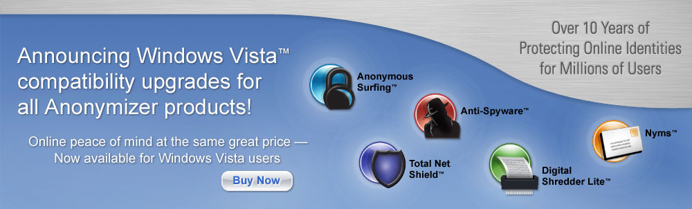 Anonymizer is the global leader in online privacy and identity protection solutions and secures your financial lifeline against would-be identity thieves using the latest and most advanced technology. Anonymizer Anonymous Surfing combines the protection of rotating anonymous IP addresses with the security of 128-bit SSL technology. Our Anonymous Surfing product will protect you against Phishing, Pharming, Spoofing, or anyone looking to "piggyback" on your Internet connection. Anonymizer identity theft protection solutions give you the peace of mind you deserve by protecting your identity with the best privacy protection on the market today.
