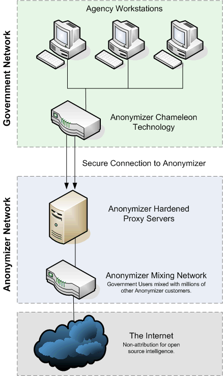 ![]() Call (858) 866-1324 or contact our government representative. Government VulnerabilitiesWhen an analyst, agent, or government official visits an external Web site, the agency’s IP address is detected and stored by Web analytic tools. These tools also collect the visitor’s operating system, Internet browser type and version, their physical location, and what they are viewing. Over time, online predators are able to build profiles on government agencies and their employees which can allow them to determine sensitive investigation or operation information. Exposed IP addresses can hinder operations in other ways as well. It can lead to inaccurate information or blocked access to Web sites. Savvy Web administrators are able to show certain visitors, such as their government investigators, inaccurate or disguised information on their site. They also have the capabilities to block visitors from viewing their Web site altogether. This makes it increasingly difficult for agencies to obtain accurate information and could lead to misinformed decisions. The SolutionThe Anonymizer® Enterprise Chameleon™ protects the government identity and provides information assurance when users are online.