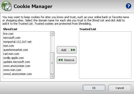 Select the sites you wish to keep and click the Add button to move those sites to the Trusted List. Alternately, if you no longer wish to protect a particular site cookie, you need only select it from the Trusted List and click Remove to add it to the Shred List.