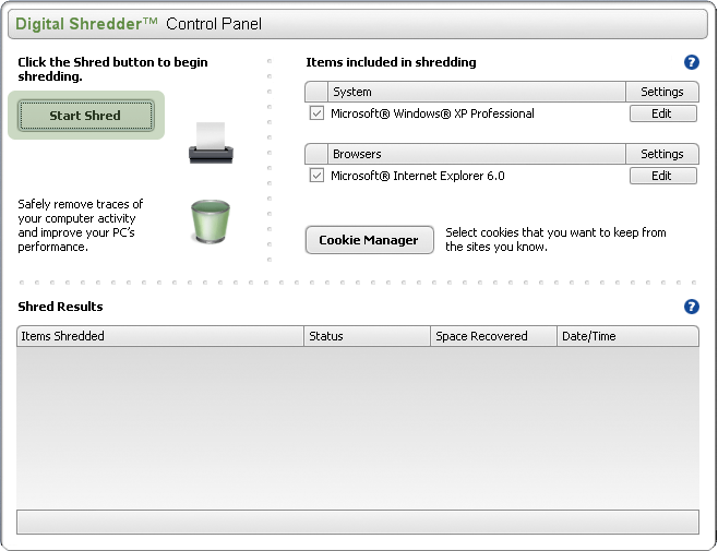 Clicking the Shred button cleans specific areas of your Windows system and Internet browsers. If you have not changed any of the default settings, the Shredder will clean all of the available Windows options, as well as all of the browser settings except for saved passwords.