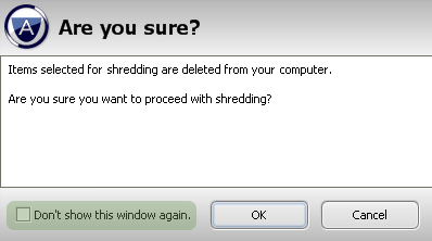 When you click the Shred button, a dialog window will appear to remind you that shredding will erase your selected items. You may choose to not see this dialog before shredding by selecting Don`t show this window again.