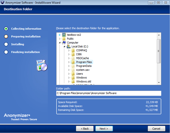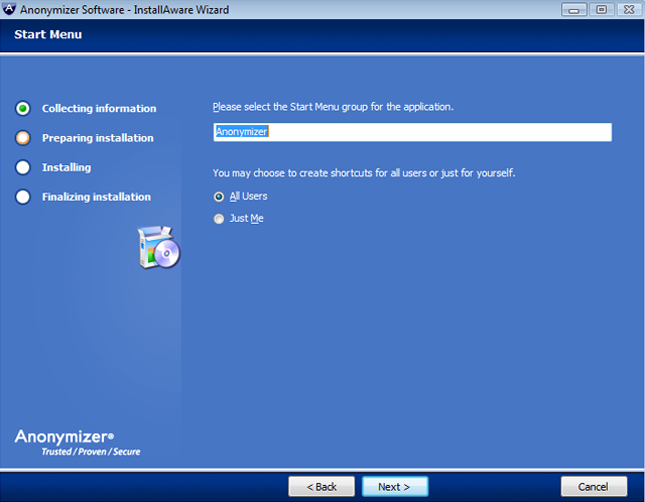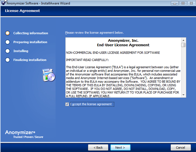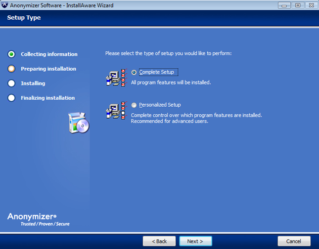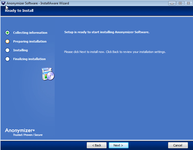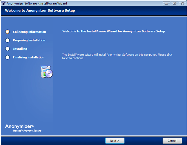 The following 8 steps should help you easily install your Anonymizer software. Our InstallAware Wizard will guide you through each step. Images are provided for additional clarification to visually guide you through the process.