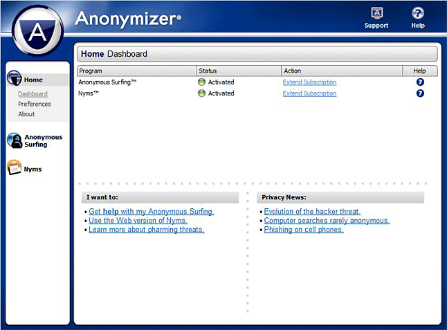 NOTE: For future reference, Your Anonymizer® Software is managed by your Dashboard, a place where you can easily control all of your online identity protection programs in one easy location. Your Dashboard also gives you access to the status of your installed Anonymizer software and quick links to get easy updates. In addition, you can also access the latest articles and announcements regarding online identify protection from your Dashboard. To find out more about your Dashboard, click here