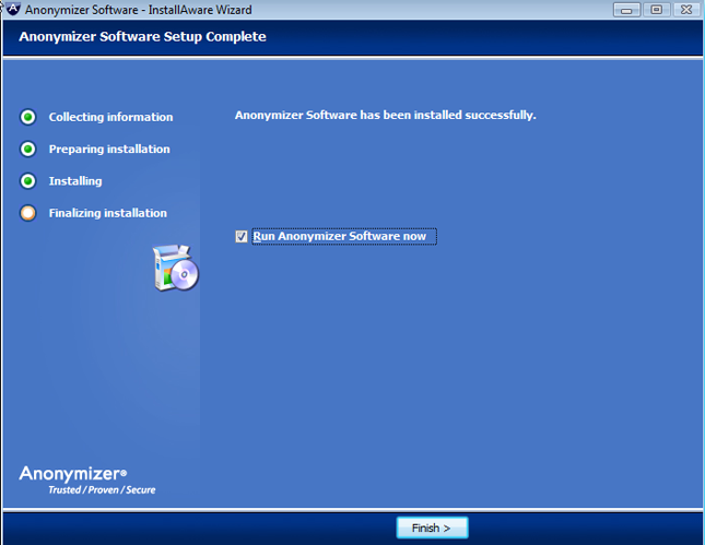 The following 8 steps should help you easily install your Anonymizer software. Our InstallAware Wizard will guide you through each step. Images are provided for additional clarification to visually guide you through the process.