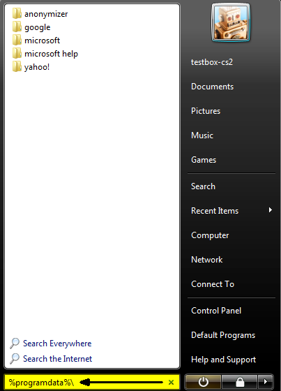 Click on the Windows icon in the lower left hand corner and type "%programdata%\" in the search field. Then hit the Enter key on the keyboard.