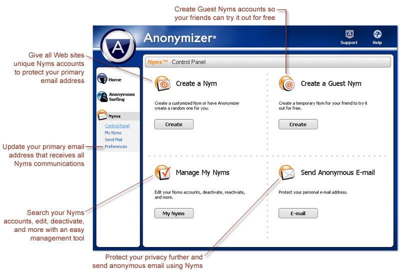 Anonymizer Nyms is a revolutionary tool that allows you to create and destroy alias email addresses giving your personal email account instant privacy. Anonymizer Nyms shields your real email address by allowing you to create a unique Nyms (disposable, email alias) every time you need to provide an email address or send email anonymously.
