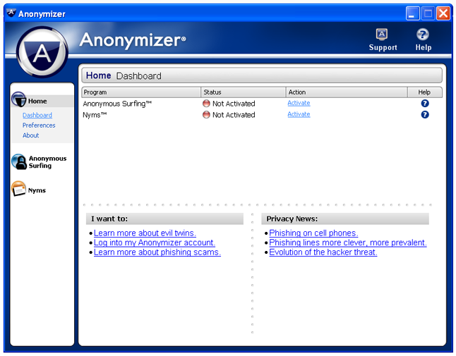 Start Here - Please Select Your ProductAnonymizer Anonymous Surfing™Anonymizer Nyms™ ApplicationAnonymizer Nyms™ Web InterfaceAnonymizer Total Net Shield™ v2.09————————————————————————-Anonymizer Total Net Shield™ v2.08Anonymizer Anti-Spyware™Anonymizer Digital Shredder Lite™————————————————————————-Go to Enterprise SupportGo to Government Support