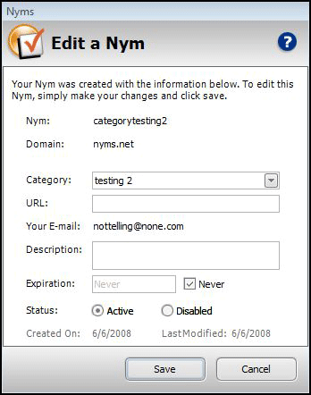 To make changes to an existing Nym, click on the "Edit" link for that account. A dialog box will open that will allow you to make any necessary changes and save your edits. If you do not wish to make any changes, simply click the "Cancel" button and it will go back to the previous screen.
