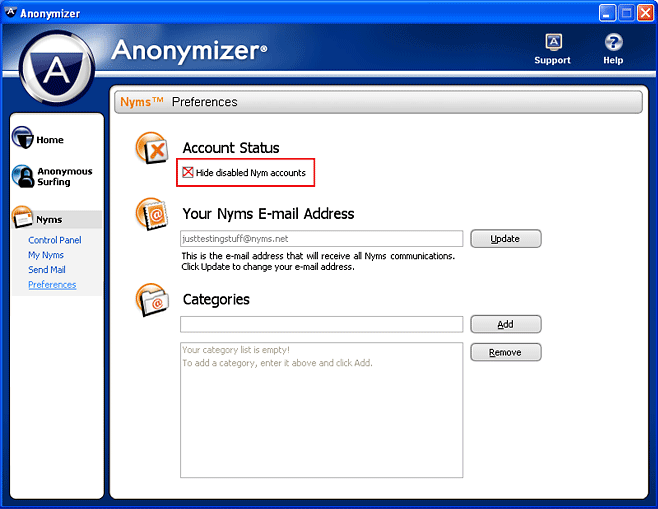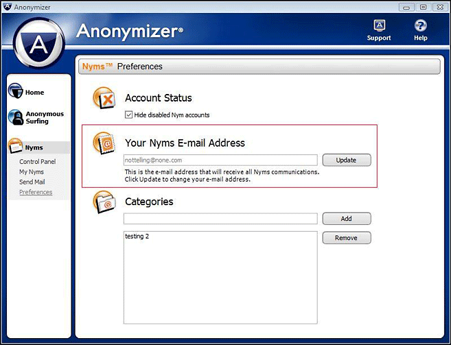 This is the email address that Anonymizer has on file for your Nyms account. All of your Nyms communications will come to this email address. You can change this by providing a new email address. Just click the "Update" button and provide a new email address. If you do change your email address, an email will be sent to your NEW account. You must click on the link provided to approve this change. If you click the link to deny the change, the account will be frozen until you go back to this Preferences section and update the email again.
