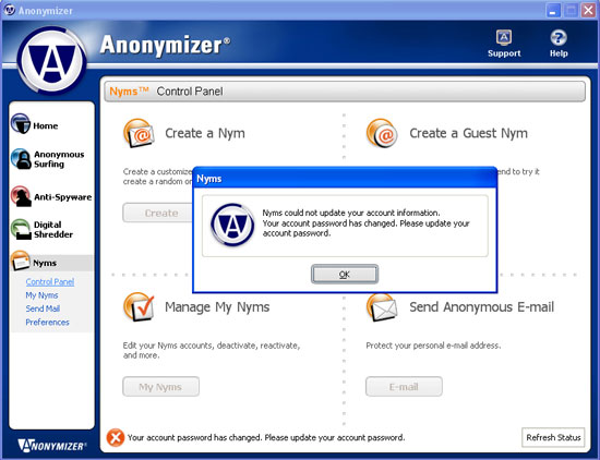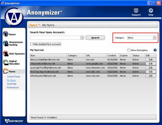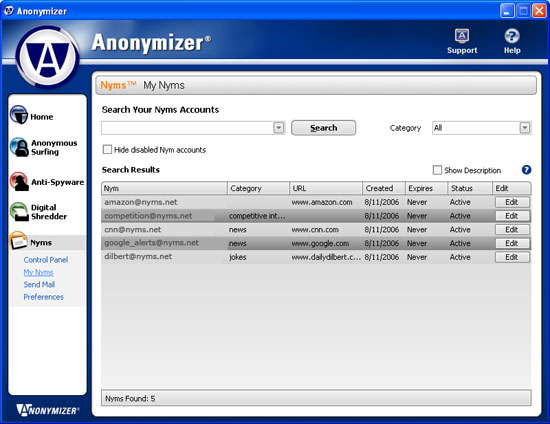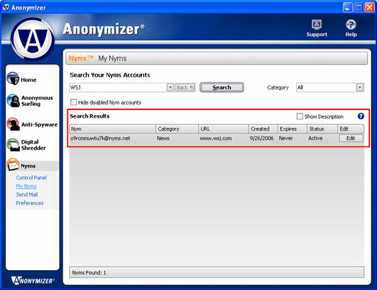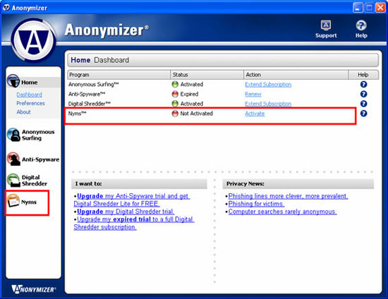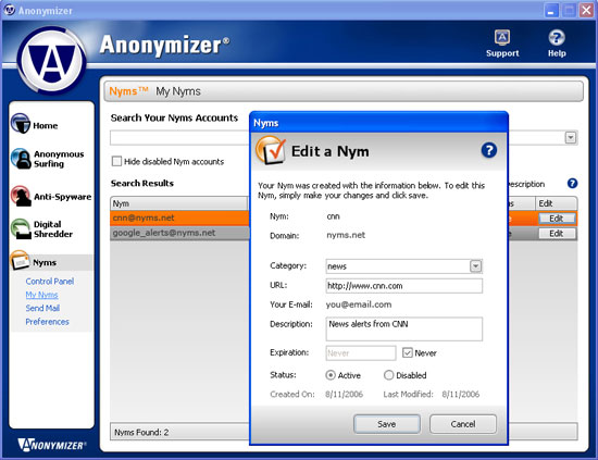 Anonymizer Nyms is also available as a Web interface. This is particularly good for people who don't have admin rights on their computers and are unable to install Nyms on their machines. To access Anonymizer Nyms Web version, please log into www.nyms.net with your username and password.
