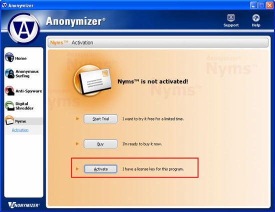 Once you have downloaded and installed Anonymizer Nyms, you will need to activate the product to use it. Please follow the next four steps to activate your new product.