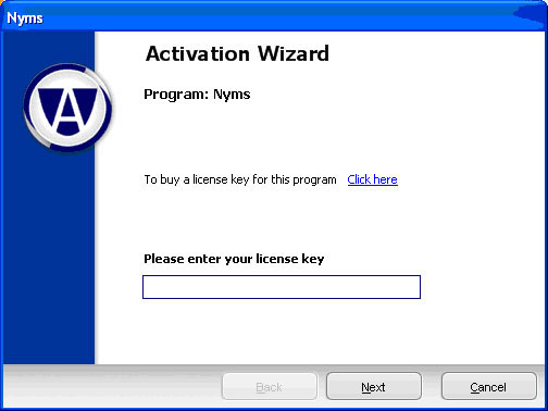 3. The Activation Wizard will open and ask you to enter your license key. This key was provided to you when you downloaded Anonymizer Nyms. Enter your key and press the "Next" button to continue.