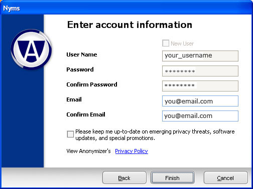 4. If you have purchased Anonymizer software before, your customer information will be pre-populated in the final activation box, as shown below. Please verify this information is up to date and click the "Finish" button. If you are a new customer, please enter your username, password, and email address and click the "Finish" button.