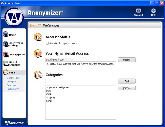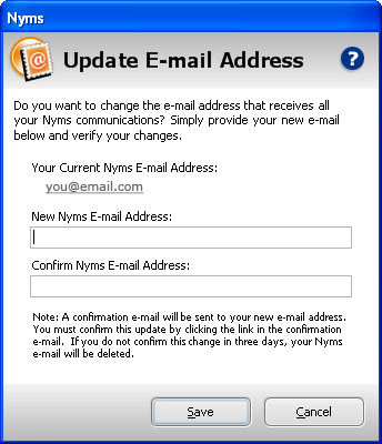 This is the email address that Anonymizer has on file for your Nyms account. All of your Nyms communications will come to this email address. You can change this by providing a new email address. If you do change your email address, an email will be sent to your NEW account. You must click on the link provided to approve this change. If you click the link to deny the change, the account will be frozen until you go back to this Preferences section and update the email again.