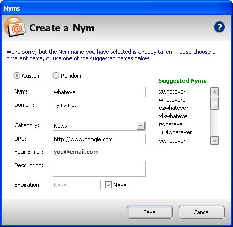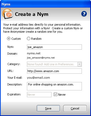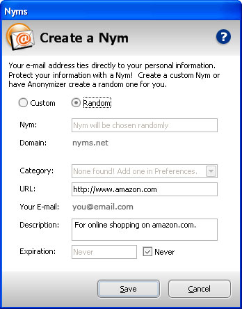 This is where you will create your unique Nyms addresses. You can create a custom Nym or have Anonymizer generate a random Nym for you.