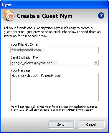 This functionality will allow you to create a temporary Nym for your friend so they can try it out for free. The invitation to try Anonymizer Nyms will be sent from one of your Nyms accounts. Simply type in your friend's email address, select the Nym account you want it to come from, and type a short message to your friend. When you click the "Send" button, the invitation will be sent to your friend. Their temporary Nym address will not be able to receive messages until they activate the account by clicking on a link in their email. They can also decline the offer to use the free Nym account or they can add their email address to a blacklist so they never receive an invitation from Anonymizer again. Rest assured, we will not share or use their email address for marketing purposes.