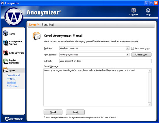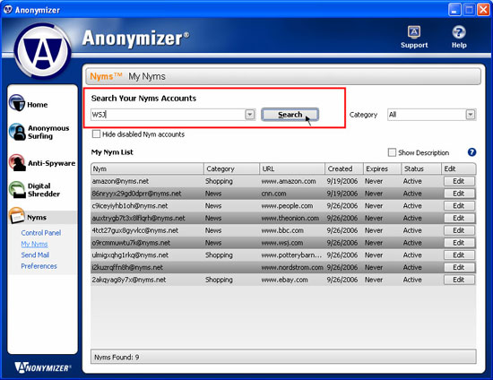 Anonymizer Nyms™ allows you to instantly create anonymous email addresses that integrate with your personal email address and protect your identity from spammers. This powerful tool makes it easy to keep your personally identifiable email address off spam lists.