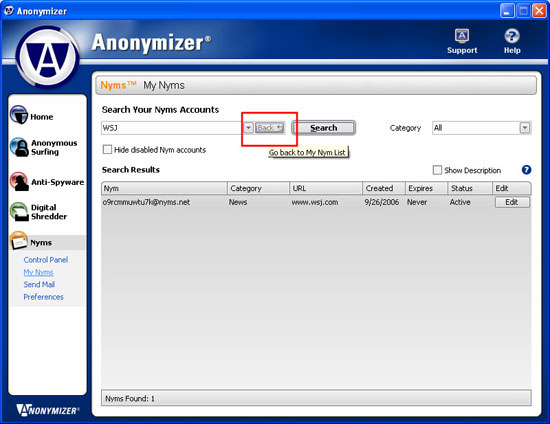 If you have a long list of existing Nyms, you can use the Search functionality to find a particular Nyms account. For example, let's say you are looking for the Nyms account that you setup for the Wall Street Journal but don't want to scroll through your entire list. Simply click on My Nyms, type your keyword (in this case, WSJ) into the search box and click the "Search" button.