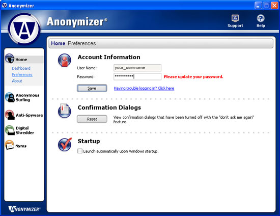 You will be automatically redirected to the Preferences section so you can update your password. Your password should match the password you use to access your account on anonymizer.com.