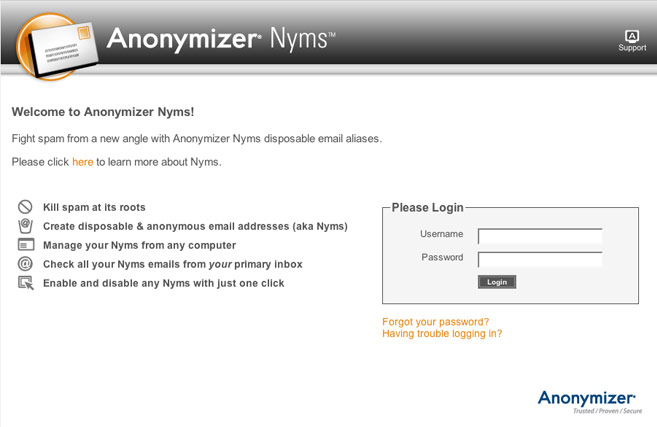 Anonymizer Nyms provides email addresses that are both anonymous and customizable. It is a personalized, proactive approach to Spam. Many Spam filters these days are indiscriminate and take out what you do want and let through what you don’t. Using Nyms you are able to look at the emails coming from this source and choose to disable the Nym and make that email address inaccessible to any source that has been given or sold the address. You can also reactivate an email address at any time or have the Nym disable automatically on a certain date. Anonymizer Nyms allows you to instantly create anonymous email addresses that integrate with your personal email address and protect your identity. This powerful tool makes it easy to keep your email address off spam lists and does not contain your personally identifiable information.