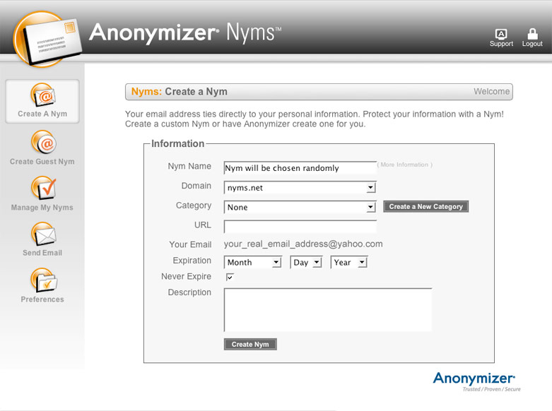 The beauty of Anonymizer Nyms lies in its flexibility. Anytime privacy or anonymity is an issue, you can create Nyms. It’s easy, use different Nyms for every Web site or correspondence that you send out...every day...every time.