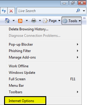 To connect securely to our Total Net Shield servers please open your Internet Explorer browser and click on Tools; then select Internet Options.