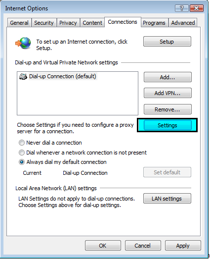 Click on the Connections tab located at the top. Then select your default Dial-up Connection and click Settings.