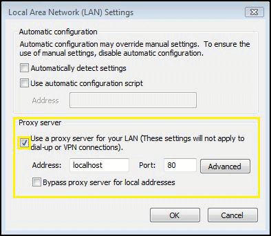 In this next window, make sure the top section in Automatic Configuration is NOT checked. Check the box Use a proxy server for your LAN. Enter the word, localhost, with no spaces and all lowercase and the Port as 80. Click OK and your browser is now secured.
