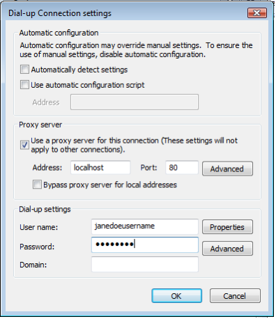 In this next window, make sure the top section in Automatic Configuration is NOT checked. Check the box Use a proxy server for your LAN. Enter the word, localhost, with no spaces and all lowercase and the Port as 80. Click OK and your browser is now secured.