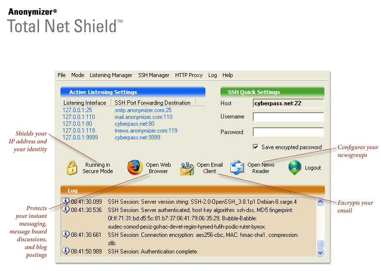 Anonymizer Total Net Shield is perfect for anyone who accesses the Internet to conduct personal online business. Whether you are accessing personal accounts, chatting online, or instant messaging, Total Net Shield provides a safe and private way to remain secure.