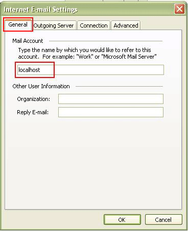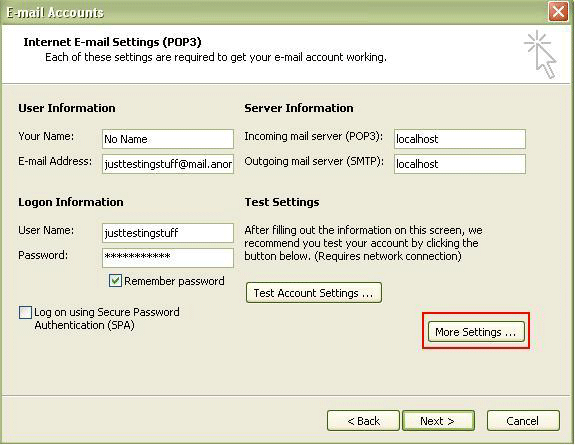 On the E-mail Accounts page, enter the name you would like displayed (this can be left blank for anonymity), Email address, Username, Password and check the box for "Remember Password." For the Incoming and Outgoing server enter the word localhost (all lowercase, no spaces). Click on More Settings to the lower right corner.