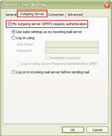 Click on the Outgoing Server tab at the top, select the check box for "My outgoing server (SMTP) requires authentication."