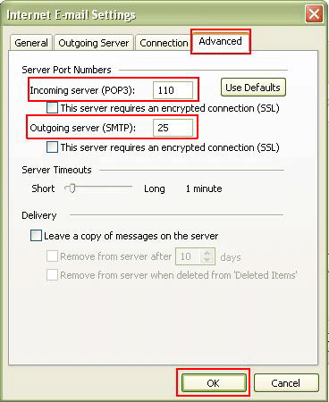 Click on the Advanced tab at the top right, make sure that the "Incoming server (POP3) is 110 and Outgoing server (SMTP) is 25" and click Ok. Ensure that Leave a copy of messages on the server is unchecked.