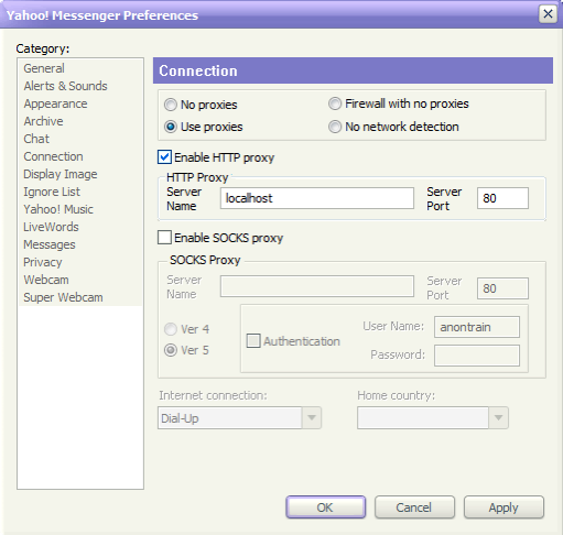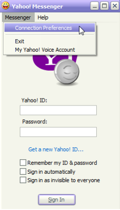To manually configure your Yahoo instant messenger client click Messenger; then select Connection Preferences.