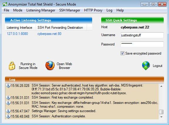 Once this is done, you will see the Anonymizer Total Net Shield icon in your system tray, which is located in the lower right hand corner down by your clock. The icon looks like a cloud with a green tube going through it. The main Total Net Shield window will appear. As long as the last message in the Log at the bottom says SSH Session: Authentication Complete, you are now ready to surf the Internet securely.