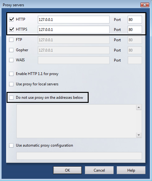 In the Proxy server window, type in the word localhost (all lowercase, no space) in the HTTP field and the Port 80; do the same for HTTPS. Click OK to finish the configurations.