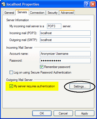 In the Outgoing Mail Server window, select ‘Log on using’ and enter your Anonymizer username and password then click OK. You are now secured to send and receive Anonymizer email.
