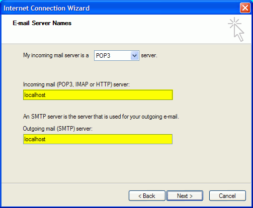 The next window will request information for incoming and outgoing email service. Please put in the word ‘localhost’ (all lowercase, no space) in both the Incoming and Outgoing mail server. Click ‘Next’ to continue to the next step.