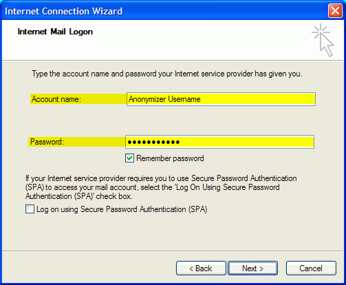 On the next page you are required to enter your Anonymizer username and password. Please do so and click next to continue to the next step.