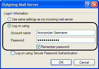 In the Outgoing Mail Server window, select ‘Log on using’ and enter your Anonymizer username and password then click OK. You are now secured to send and receive Anonymizer email.