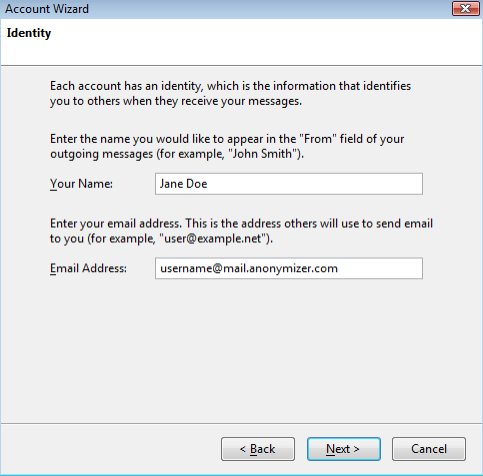 Enter your Name and your Anonymizer Email Address, this is yourusername@mail.anonymizer.com. Click Next to continue.