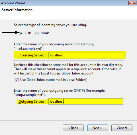 Select the POP server and enter localhost for the Incoming Server address. Click Next to continue.
