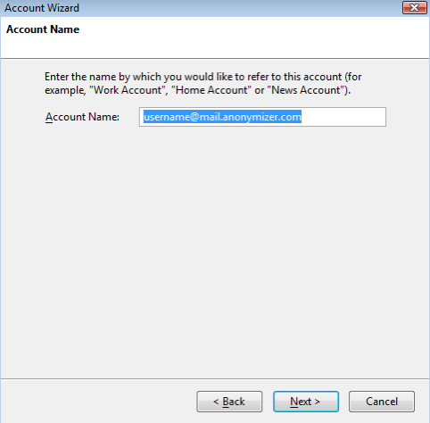 Choose an Account Name for the name of this email account. You can choose anything like; Home, Work, or Anonymizer, etc. Click Next to continue.