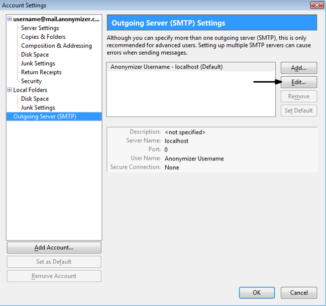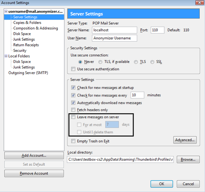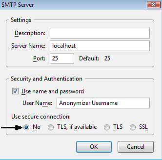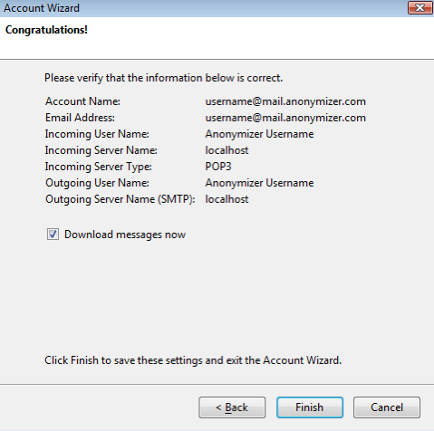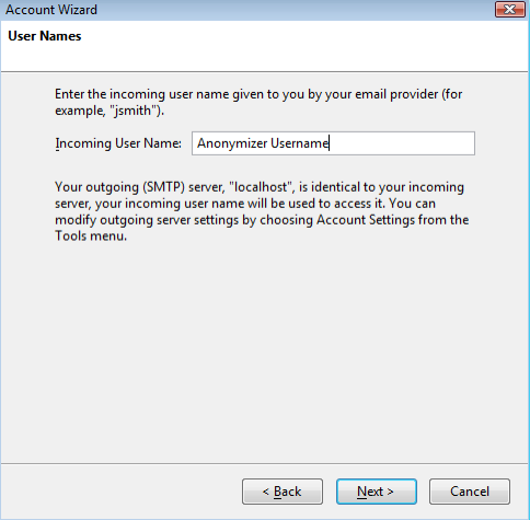Enter your Name and your Anonymizer Email Address, this is yourusername@mail.anonymizer.com. Click Next to continue.
