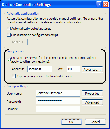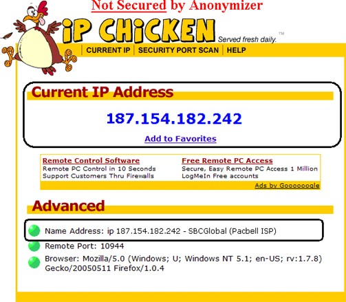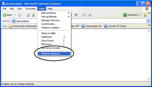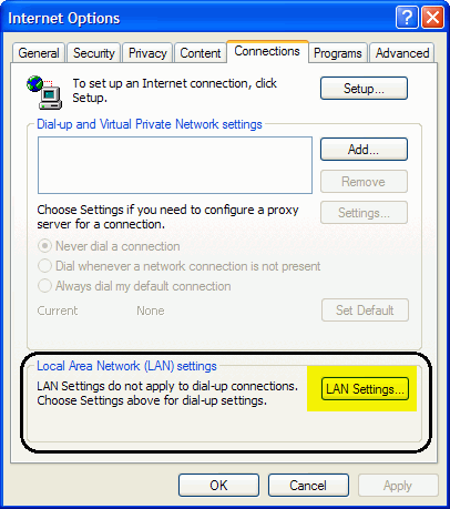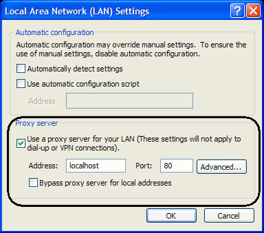 Anonymizer Total Net Shield - Internet Explorer Browser ConfigurationDial Up/DSL To configure your Internet Explorer browser to connect securely to our Total Net Shield servers, please open your Internet Explorer browser and click on Tools > Internet Options. Click on the ‘Connection’ tab up at the top and select your Default dial up connection and click ‘Settings’. In this next window, make sure the top section in ‘Automatic Configuration’ is NOT checked. And check ‘Use a proxy server for this connection’. Enter the word, localhost, with no spaces and all lowercase and the Port as 80. Click OK and your browser is now secured. You are now set up to browse the internet anonymously; you can check your configuration settings at any website that can trace your IP address. Please go to http://www.ipchicken.com, if you are being secured by Anonymizer you will see the IP address the same as the Name Address (this IP address changes). If you are not being secured you will see your ISP Information in the Name Address. Internet Explorer (LAN) To configure your Internet Explorer browser to connect securely to our Total Net Shield servers, please open your Internet Explorer browser and click on Tools > Internet Options. Click on the ‘Connection’ tab up at the top and click on ‘LAN Settings’ at the lower right. In this next window, make sure the top section in ‘Automatic Configuration’ is NOT checked. And check the box ‘Use a proxy server for your LAN’. Enter the word, localhost, with no spaces and all lowercase and the Port as 80. Click OK and your browser is now secured. |
