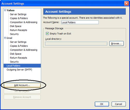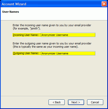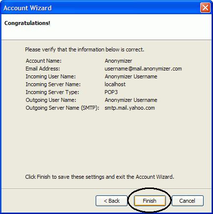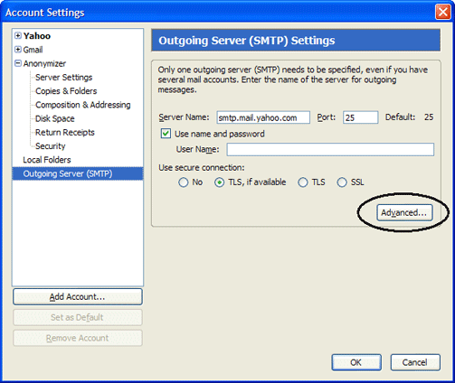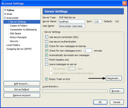 Anonymizer Total Net Shield - Thunderbird Email ConfigurationOpen Thunderbird and click on Tools>Account Settings. Once in the Account Settings, click on ‘Add Account’ at the bottom left. Select ‘Email Account’ and click Next. Next screen for Identity, enter your Name and your Anonymizer Email address, this is yourusername@mail.anonymizer.com. Click Next to continue. On the Server Information window select the POP server and enter, localhost, for the Incoming Server address. Click Next to continue. Enter your Anonymizer Username that you created in the ‘Incoming Username’ field and enter the same username for the Outgoing as well. Choose an Account Name for the name of this email account, you can choose anything like, Home, Work, or Anonymizer, etc. Click Next to continue. Next window is the completion of the Setup. Click Finish to save the settings. Select ‘Outgoing Server (SMTP)’ to the left and click on ‘Advanced’ to the right. Choose ‘Add’ for a new Outgoing Server. Open the Anonymizer settings to the left and click on ‘Server Settings’, then click ‘Advanced’ to the lower right. Click on the SMTP tab at the top left. Click on the arrow to show the list of Outgoing servers you have. Select the Anonymizer server, localhost:25. Click OK and you are now all set up to send/receive secure email through the Anonymizer email account. Please make sure to send a test email to and from this account to make sure everything is working properly. Click on ‘Server Settings’ and make sure ‘Leave messages on server’ is NOT checked. |