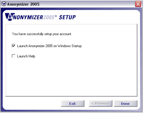 You’ll see this “success” screen once you’ve completed the setup process. At this point, you may choose to launch the Anonymizer 2005 program or open Help if you wish.