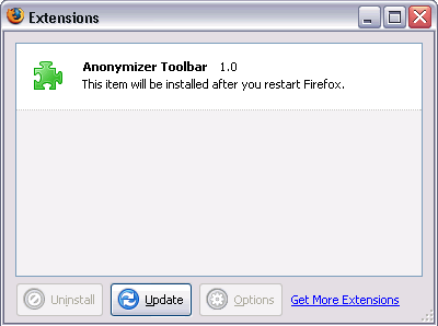 • If you have another advanced tabbed browsing extension installed in Firefox, you may have problems installing the Anonymizer toolbar extension. Try disabling other extensions before running the toolbar extension installer.