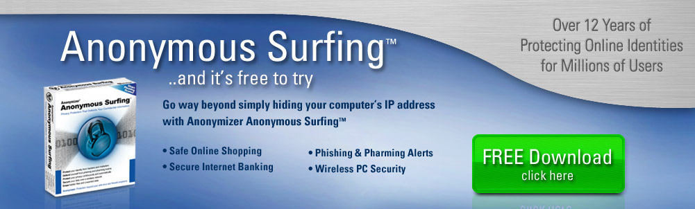 Anonymizer is the global leader in online privacy and identity protection solutions and secures your financial lifeline against would-be identity thieves using the latest and most advanced technology. Anonymizer Anonymous Surfing combines the protection of rotating anonymous IP addresses with the security of 128-bit SSL technology. Our Anonymous Surfing product will protect you against Phishing, Pharming, Spoofing, or anyone looking to "piggyback" on your Internet connection. Anonymizer identity theft protection solutions give you the peace of mind you deserve by protecting your identity with the best privacy protection on the market today.